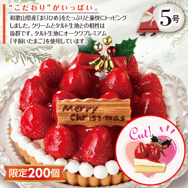 和歌山県産「まりひめ」をたっぷりと豪快にトッピングしました。クリームとタルト生地との相性は抜群です。タルト生地にオークワプレミアム「平飼いたまご」を使用しています。
