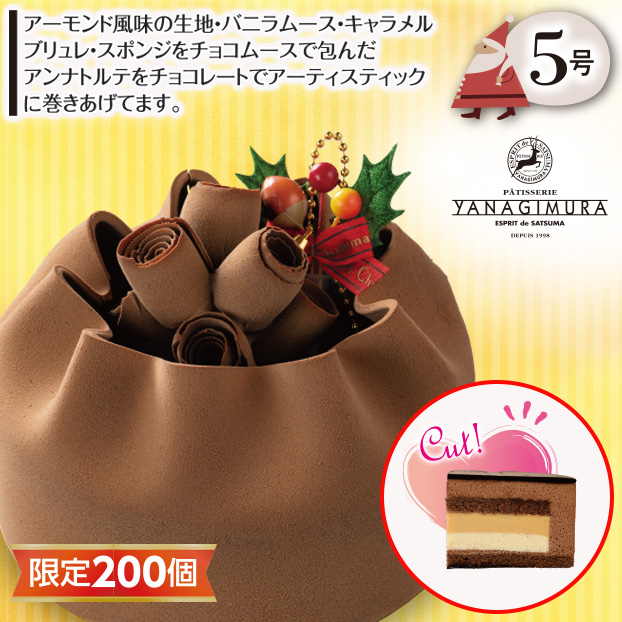 アーモンド風味の生地・バニラムース・キャラメルブリュレ・スポンジをチョコムースで包んだアンナトルテをチョコレートでアーティスティックに巻きあげてます。