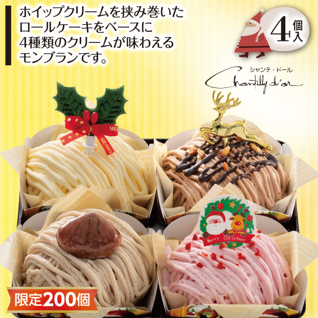 ホイップクリームを挟み巻いたロールケーキをベースに4種類のクリームが味わえるモンブランです。
