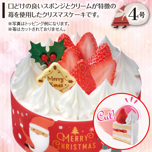 口どけの良いスポンジとクリームが特徴の苺を使用したクリスマスケーキです。写真はトッピング例になります。苺はカットされておりません。