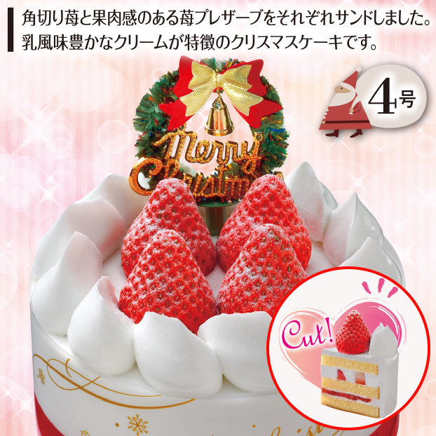 角切り苺と果肉感のある苺プレザーブをそれぞれサンドしました。乳風味豊かなクリームが特徴のクリスマスケーキです。