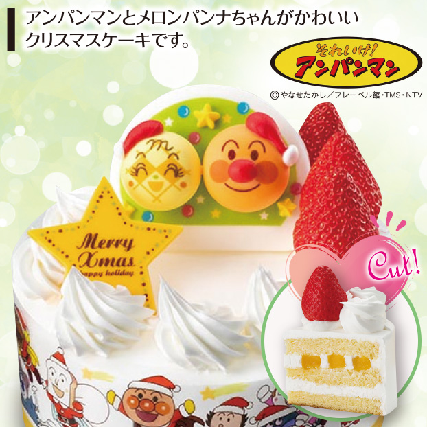 アンパンマンとメロンパンナちゃんがかわいいクリスマスケーキです。