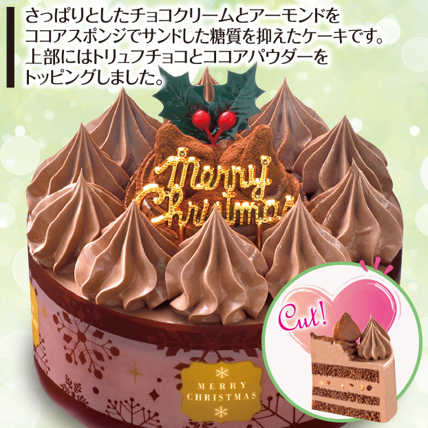 さっぱりとしたチョコクリームとアーモンドを ココアスポンジでサンドした糖質を抑えたケーキです。上部にはトリュフチョコとココアパウダーをトッピングしました。※「日本食品標準成分表2020年版のショートケーキ(果実なし)との比較(100g当たり)で糖質57%オフ(エリスリトールを除いた糖質の比較では67%オフ)」