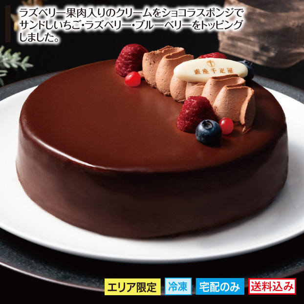 ラズベリー果肉入りのクリームをショコラスポンジでサンドしいちご・ラズベリー・ブルーベリーをトッピングしました。