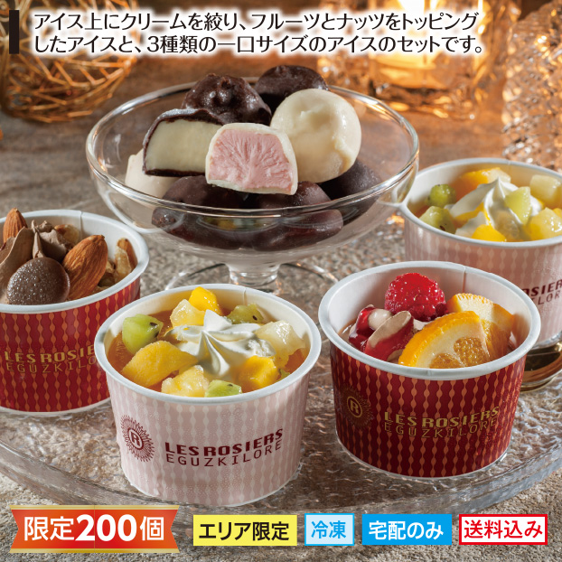 アイス上にクリームを絞り、フルーツとナッツをトッピングしたアイスと、3種類の一口サイズのアイスのセットです。