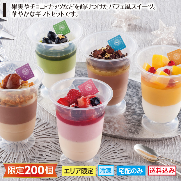 果実やチョコ・ナッツなどを飾りつけたパフェ風スイーツ。 華やかなギフトセットです