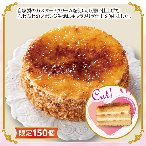 自家製のカスタードクリームを使い、5層に仕上げたふわふわのスポンジ生地にキャラメリゼ仕上を施しました。