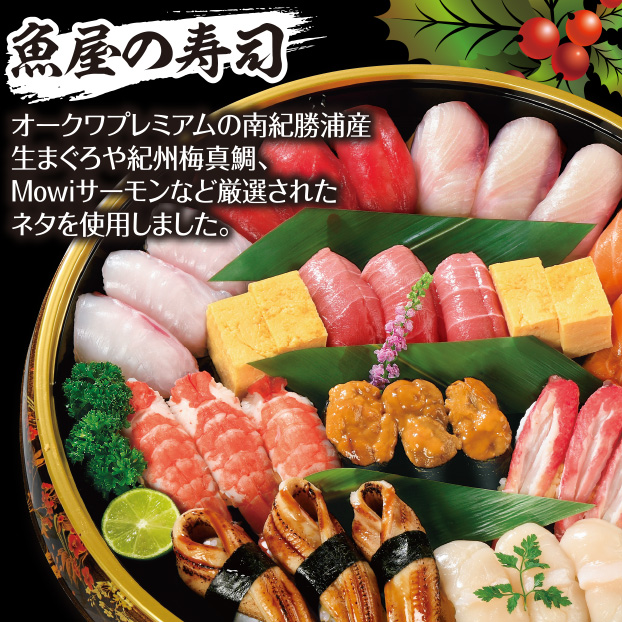 オークワプレミアムの南紀勝浦産生まぐろや紀州梅真鯛、Mowiサーモンなど厳選されたネタを使用しました。 ※3人前