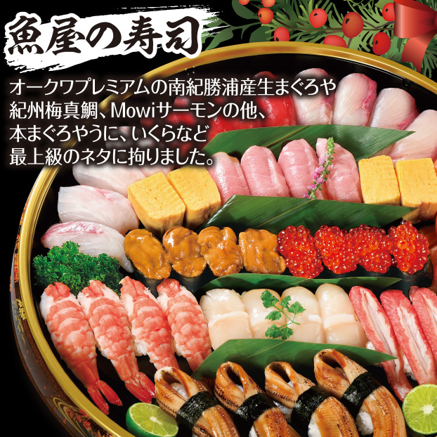 オークワプレミアムの南紀勝浦産生まぐろや紀州梅真鯛、Mowiサーモンの他、本まぐろやうにいくらなど最上級のネタに拘りました。 ※4人前