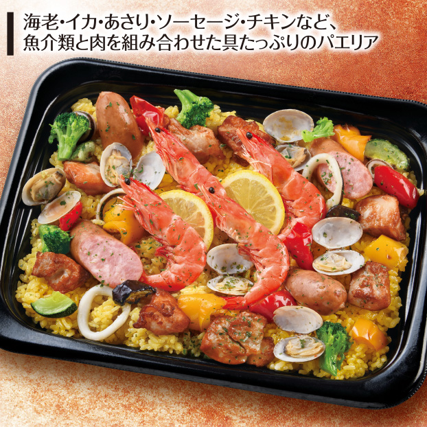 海老・イカ・あさり・ソーセージ・チキンなど、魚介類と肉を組み合わせた具たっぷりのパエリア