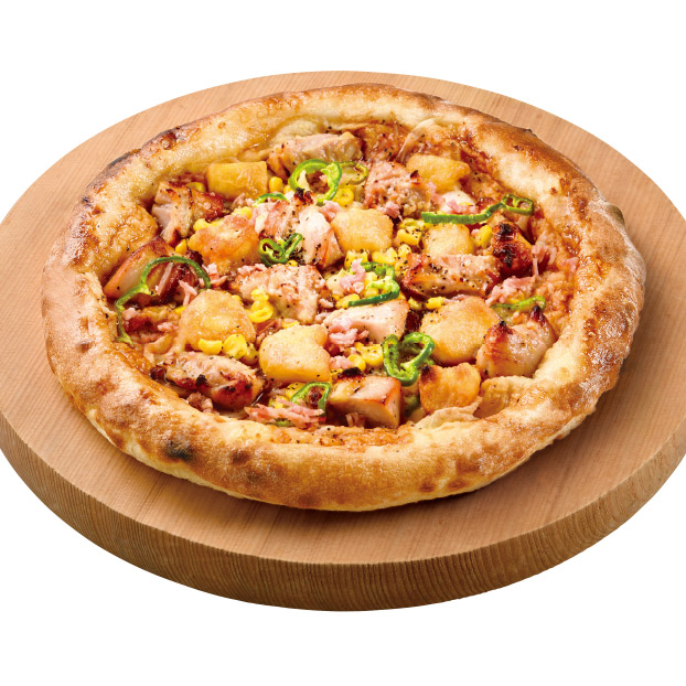 BBQソースをベースにローストチキン・フライドポテト・ベーコン・タマネギ・チーズをトッピングしたアメリカンスタイルのピザ!