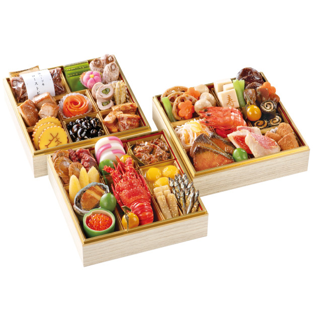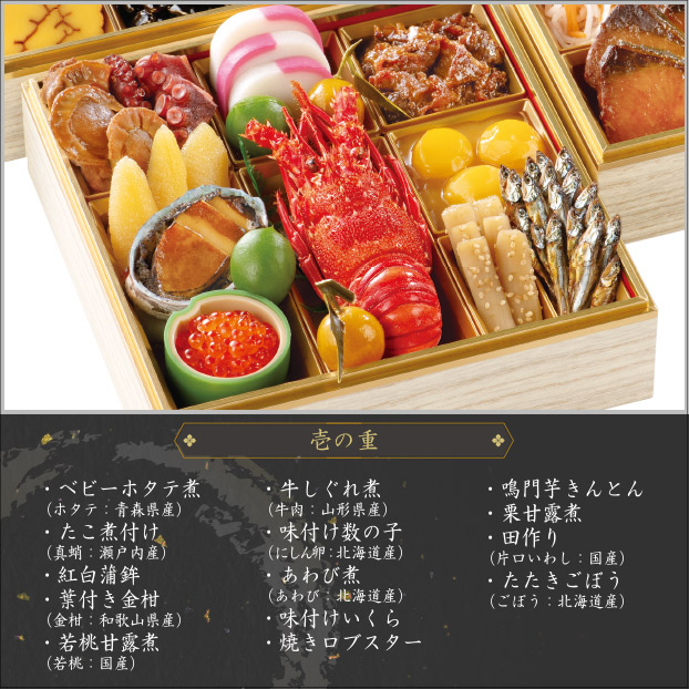 ベビーホタテ煮(ホタテ:青森県産)、たこ煮付け(真蛸:瀬戸内産)、紅白蒲鉾、葉付き金柑(金柑:和歌山県産)、若桃甘露煮(若桃:国産)、牛しぐれ煮(牛肉:山形県産)、味付け数の子(にしん卵:北海道産)、あわび煮(あわび:北海道産)、味付けいくら、焼きロブスター、鳴門芋きんとん、栗甘露煮、田作り(片口いわし:国産)、たたきごぼう(ごぼう:北海道産)