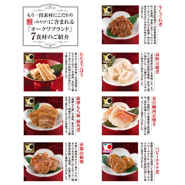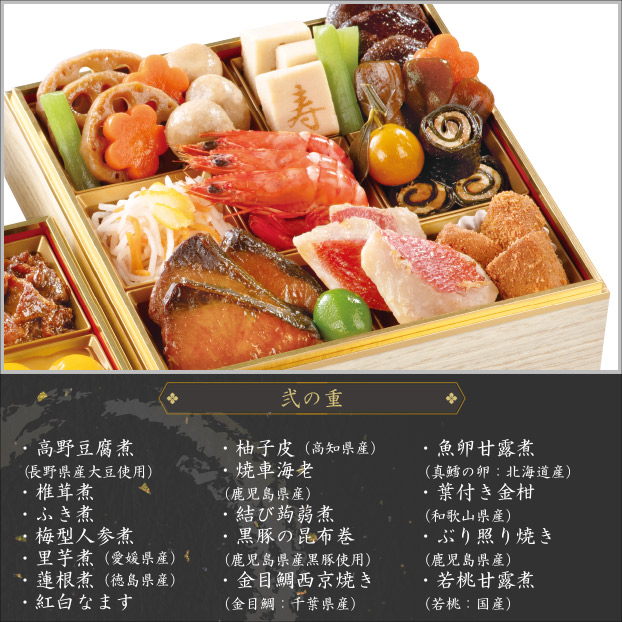 高野豆腐煮(高野豆腐:長野県産大豆使用)、椎茸煮、ふき煮、梅型人参煮、里芋煮(里芋:愛媛県産)、蓮根煮(蓮根:徳島県産)、紅白なます、柚子皮(ゆず:高知県産)、焼車海老(車海老:鹿児島県産)、結び蒟蒻煮、黒豚の昆布巻(鹿児島県産黒豚使用)、金目鯛西京焼き(金目鯛:千葉県産)、魚卵甘露煮(真鱈の卵:北海道産)、葉付き金柑(金柑:和歌山県産)、ぶり照り焼き(ぶり:長崎県産)、若桃甘露煮(若桃:国産)
