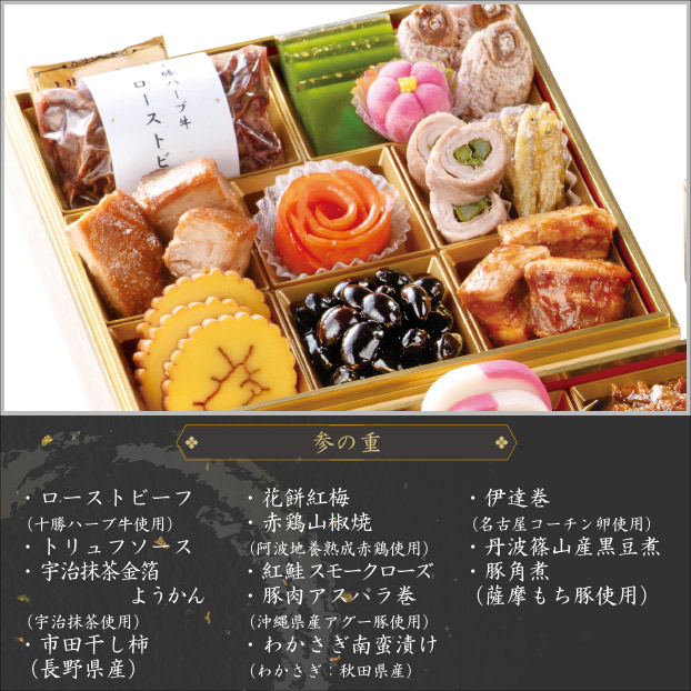 ローストビーフ(十勝ハーブ牛使用)、トリュフソース、宇治抹茶金箔ようかん(宇治抹茶使用)、市田干し柿(柿:長野県産)、花餅紅梅、赤鶏山椒焼(阿波地養熟成赤鶏使用)、紅鮭スモークローズ、豚肉アスパラ巻(沖縄県産アグー豚使用)、わかさぎ南蛮漬け(わかさぎ:秋田県産)、伊達巻(名古屋コーチン卵使用)、丹波篠山産黒豆煮、豚角煮(薩摩もち豚使用)