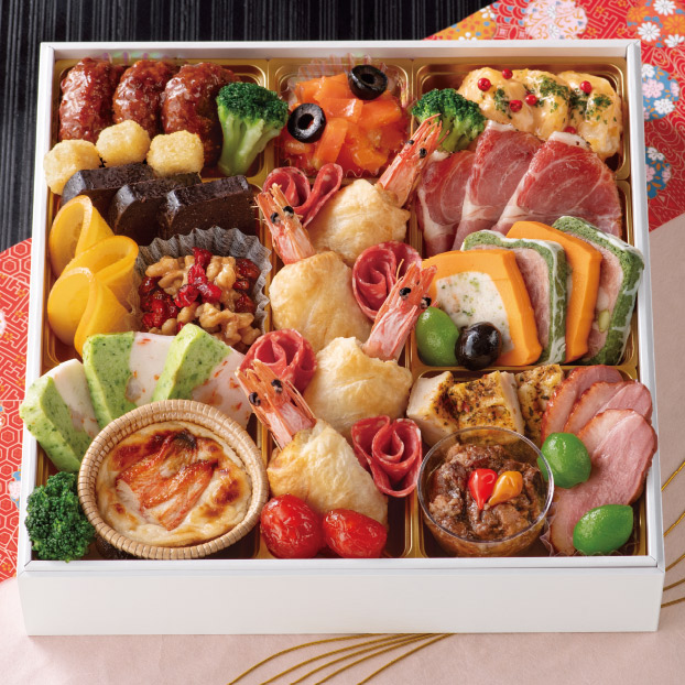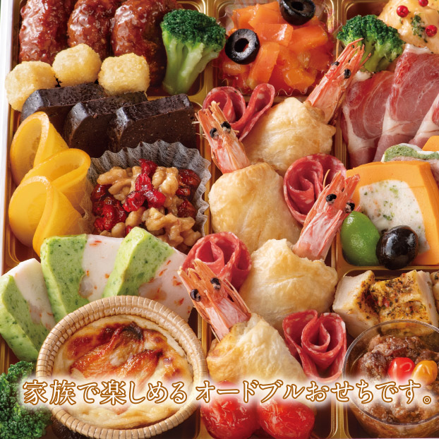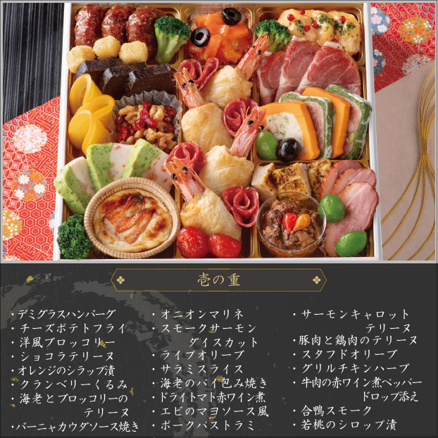 デミグラスハンバーグ、チーズポテトフライ、洋風ブロッコリー、ショコラテリーヌ、オレンジのシラップ漬、クランベリーくるみ、海老とブロッコリーのテリーヌ、バーニャカウダーソース焼、オニオンマリネ、スモークサーモンダイスカット、ライプオリーブ、サラミスライス、海老のパイ包み焼き、ドライトマト赤ワイン煮、エビのマヨソース風、ポークパストラミ、サーモンキャロットテリーヌ、豚肉と鶏肉のテリーヌ、スタフドオリーブ、グリルチキンハーブ、牛肉の赤ワイン煮ペッパードロップ添え、合鴨スモーク、若桃のシロップ漬