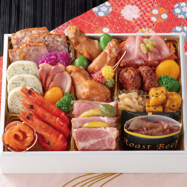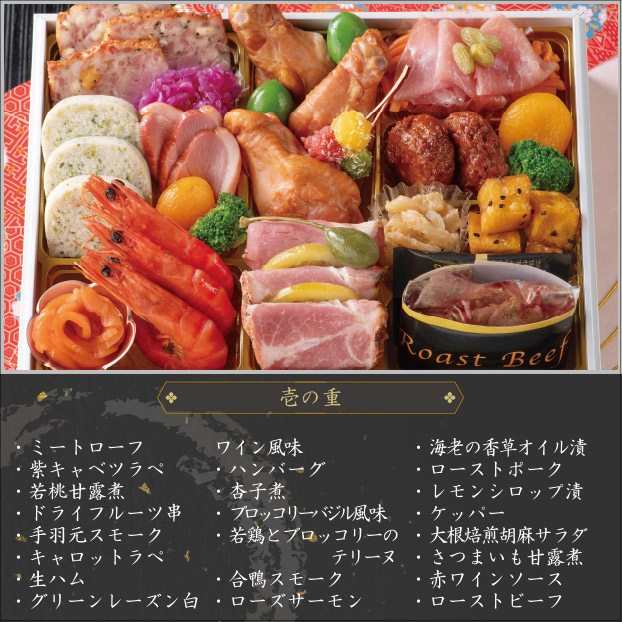 ミートローフ、紫キャベツラぺ、若桃甘露煮、ドライフルーツ串、手羽元スモーク、キャロットラぺ、生ハム、グリーンレーズン白ワイン風味、ハンバーグ、杏子煮、ブロッコリーバジル風味、若鶏とブロッコリーのテリーヌ、合鴨スモーク、ローズサーモン、海老の香草オイル漬、ローストポーク、レモンシロップ漬、ケッパー、大根焙煎胡麻サラダ、さつまいも甘露煮、赤ワインソース、ローストビーフ