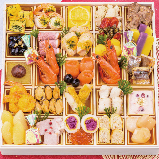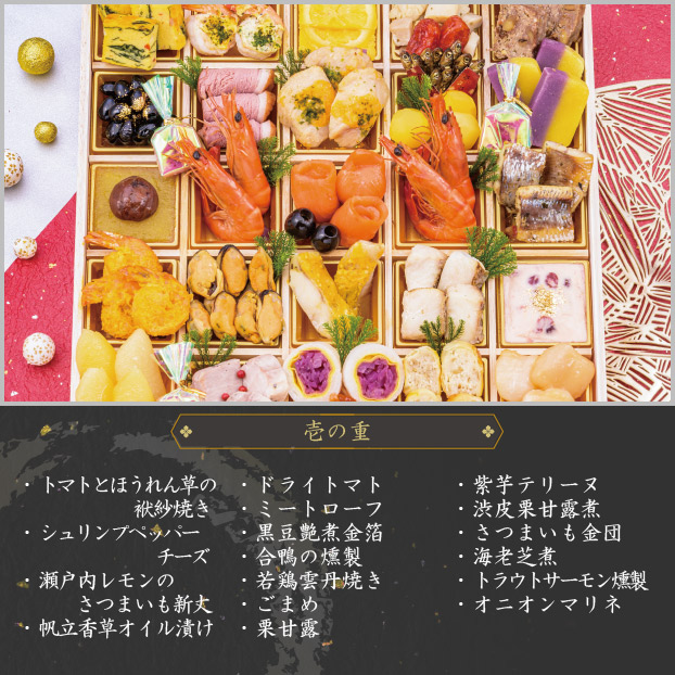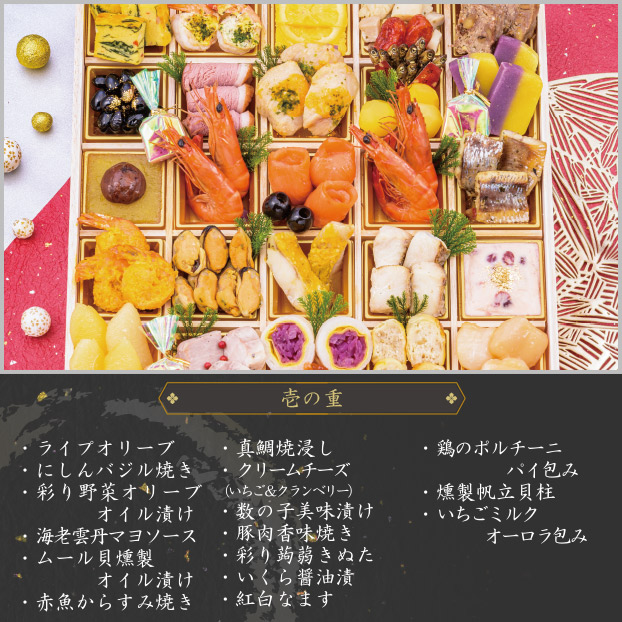 トマトとほうれん草の袱紗焼き、シュリンプペッパーチーズ、瀬戸内レモンのさつまいも新丈、帆立香草オイル漬け、ドライトマト、ミートローフ、黒豆艶煮金箔、合鴨の燻製、若鶏雲丹焼き、ごまめ、栗甘露、紫芋テリーヌ、渋皮栗甘露煮、さつまいも金団、海老芝煮、トラウトサーモン燻製、オニオンマリネ、ライプオリーブ、にしんバジル焼き、彩り野菜オリーブオイル漬け、海老雲丹マヨソース、ムール貝燻製オイル漬け、赤魚からすみ焼き、真鯛焼浸し、クリームチーズ(いちご&クランベリー)、数の子美味漬け、豚肉香味焼き、彩り蒟蒻きぬた、いくら醤油漬、紅白なます、鶏のポルチーニパイ包み、燻製帆立貝柱、いちごミルクオーロラ包み