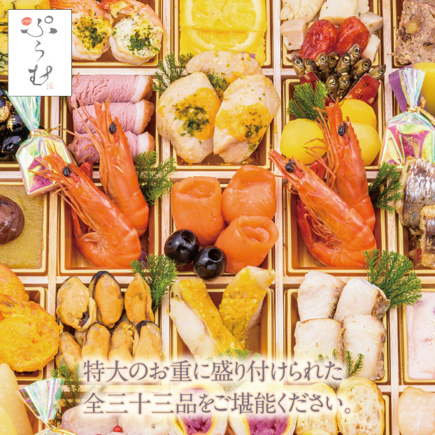 特大のお重に盛り付けられた全三十三品をご堪能ください。