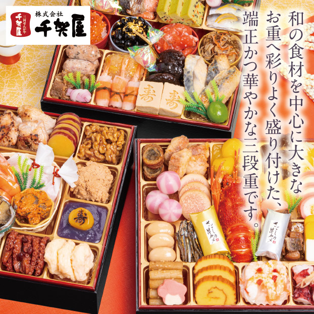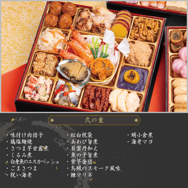 味付け肉団子、鶏塩麹焼、さつま芋甘露煮、くるみ煮、白身魚のエスカベッシュ、ごまさつま、祝い海老、紅白祝袋、あわび旨煮、貝雲丹和え、魚の子旨煮、紫芋金団、烏賊のスモーク風味、鰊マリネ、蛸小倉煮、海老マヨ