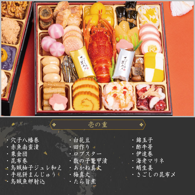 穴子八幡巻、赤魚南蛮漬、栗金団、昆布巻、烏賊柚子ジュレ和え、手毬餅まんじゅう、烏賊魚卵射込、白花豆、田作り、ロブスター、数の子鼈甲漬、あかね真丈、梅真丈、たら旨煮、錦玉子、酢牛蒡、伊達巻、海老マリネ、蛸生姜、さごしの昆布〆