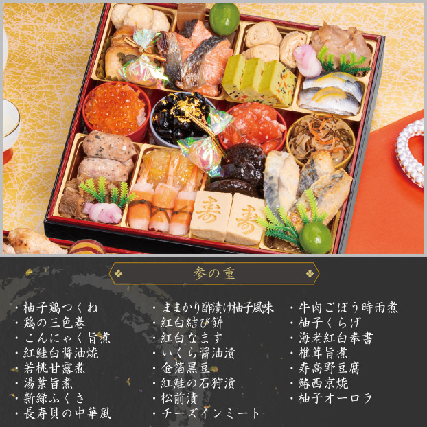 柚子鶏つくね、鶏の三色巻、こんにゃく旨煮、紅鮭白醤油焼、若桃甘露煮、湯葉旨煮、新緑ふくさ、長寿貝の中華風、ままかり酢漬け柚子風味、紅白結び餅、紅白なます、いくら醤油漬、金箔黒豆、紅鮭の石狩漬、松前漬、チーズインミート、牛肉ごぼう時雨煮、柚子くらげ、海老紅白奉書、椎茸旨煮、寿高野豆腐、鰆西京焼、柚子オーロラ