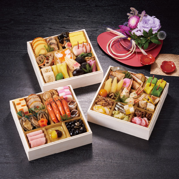 おせち料理の定番の料理に加えて、鮑や蟹、帆立などの魚介類やペッパーボンレスハム、合鴨スモークなどの肉料理、野菜料理をバランス良く3段重に盛り込みました。市松模様の錦糸巻や紅白蒲鉾、二色の生麩など、見た目も彩り豊かで、幅広い年齢層の方にお楽しみいただけます。