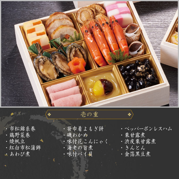市松錦糸巻、鶏野菜巻、焼帆立、紅白市松蒲鉾、あわび煮、笹巾着よもぎ餅、磯わかめ、味付花こんにゃく、海老の旨煮、味付バイ貝、ペッパーボンレスハム、栗甘露煮、渋皮栗甘露煮、きんとん、金箔黒豆煮