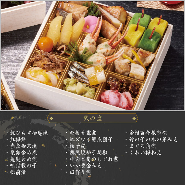 銀ひらす柚庵焼、紅梅餅、赤魚西京焼、粟麩含め煮、蓬麩含め煮、味付数の子、松前漬、金柑甘露煮、紅ズワイ蟹爪団子、柚子皮、鶏照焼柚子胡椒、牛肉と筍のしぐれ煮、いか黄金和え、田作り煮、金柑百合根市松、竹の子の木の芽和え、まぐろ角煮、くわい梅和え