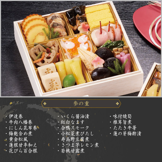 伊達巻、牛肉八幡巻、にしん昆布巻、梅麩含め煮、黄金松風、蓮根甘辛和え、花びら百合根、いくら醤油漬、紅白なます、合鴨スモーク、小松菜煮びたし、寿高野豆腐煮、さつま芋レモン煮、若桃甘露煮、味付焼筍、椎茸旨煮、たたき牛蒡、蓮の芽梅酢漬