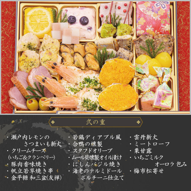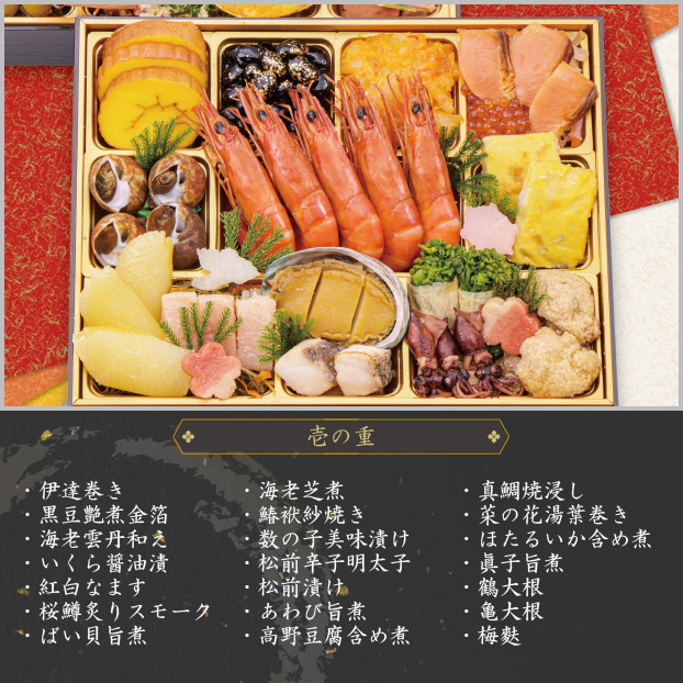 伊達巻き、黒豆艶煮金箔、海老雲丹和え、いくら醤油漬、紅白なます、桜鱒炙りスモーク、ばい貝旨煮、海老芝煮、鰆袱紗焼き、数の子美味漬け、松前辛子明太子、松前漬け、あわび旨煮、高野豆腐含め煮、真鯛焼浸し、菜の花湯葉巻き、ほたるいか含め煮、眞子旨煮、鶴大根、亀大根、梅麩