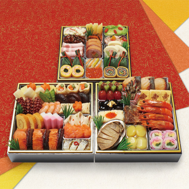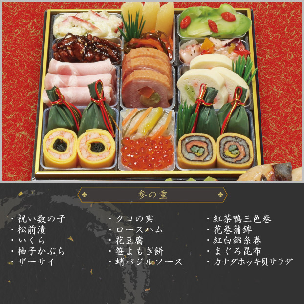祝い数の子、松前漬、いくら、柚子かぶら、ザーサイ、クコの実、ロースハム、花豆腐、笹よもぎ餅、蛸バジルソース、紅茶鴨三色巻、花巻蒲鉾、紅白錦糸巻、まぐろ昆布、カナダホッキ貝サラダ