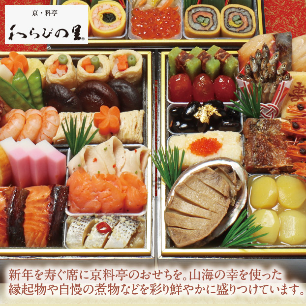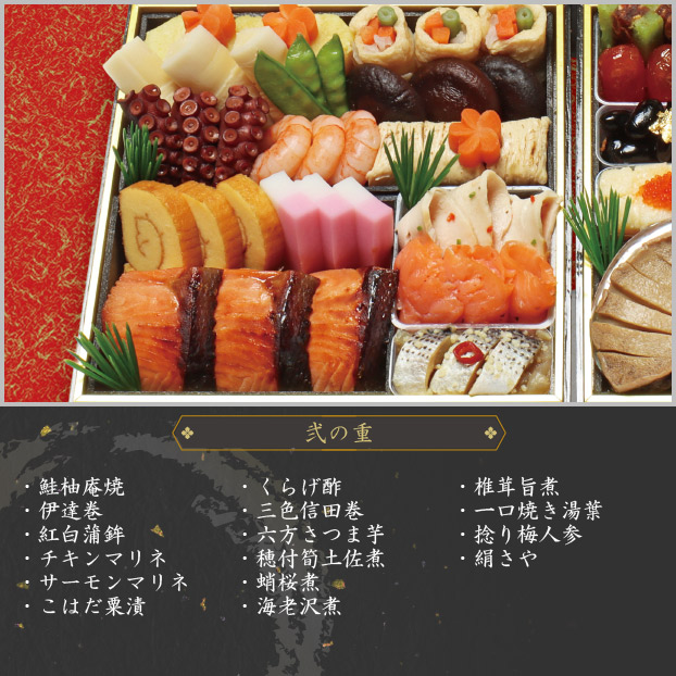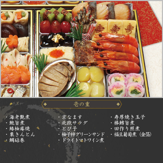 海老艶煮、鮑旨煮、鰆柚庵焼、栗きんとん、鯛砧巻、京なます、北欧サラダ、とび子、柚子柿グリーンサンド、ドライトマトワイン煮、寿厚焼き玉子、棒鱈旨煮、田作り照煮、福豆葡萄煮(金箔)