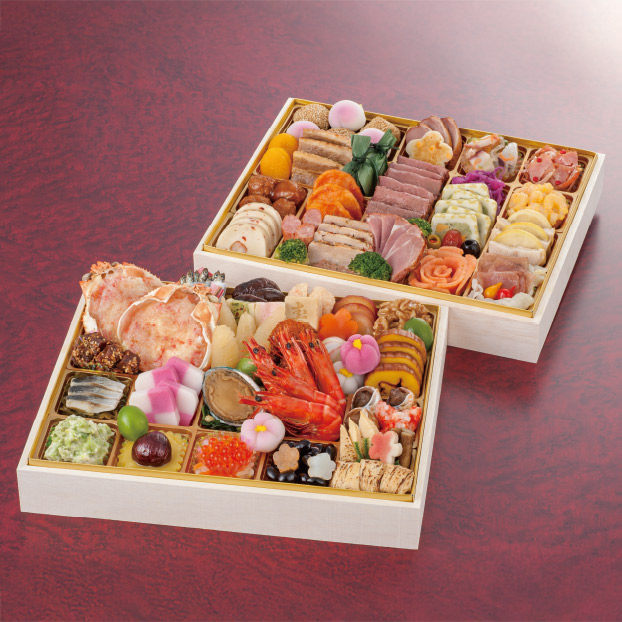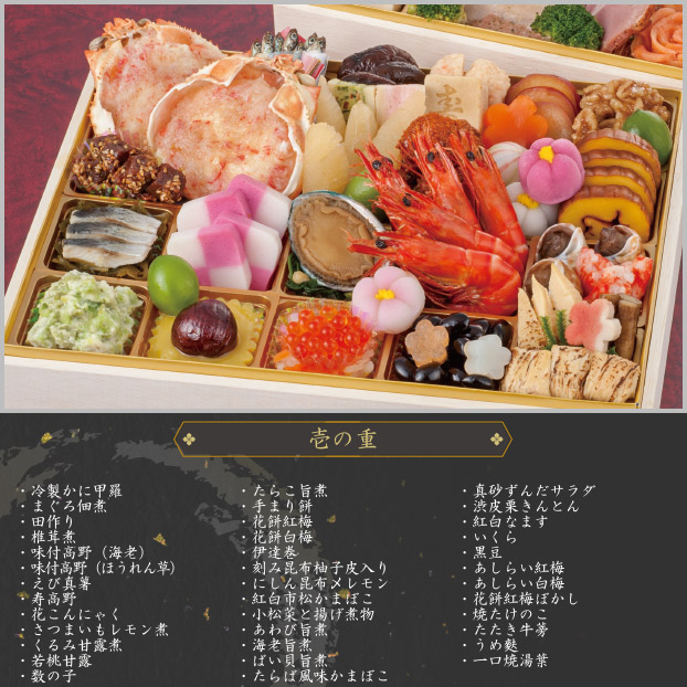 冷製かに甲羅、まぐろ佃煮、田作り、椎茸煮、味付高野(海老)、味付高野(ほうれん草)、えび真薯、寿高野、花こんにゃく、さつまいもレモン煮、くるみ甘露煮、若桃甘露、数の子、たらこ旨煮、手まり餅、花餅紅梅、花餅白梅、伊達巻、刻み昆布柚子皮入り、にしん昆布〆レモン、紅白市松かまぼこ、小松菜と揚げ煮物、あわび旨煮、海老旨煮、ばい貝旨煮、たらば風味かまぼこ、真砂ずんだサラダ、渋皮栗きんとん、紅白なます、いくら、黒豆、あしらい紅梅、あしらい白梅、花餅紅梅ぼかし、焼たけのこ、たたき牛蒡、、うめ麩、一口焼湯葉