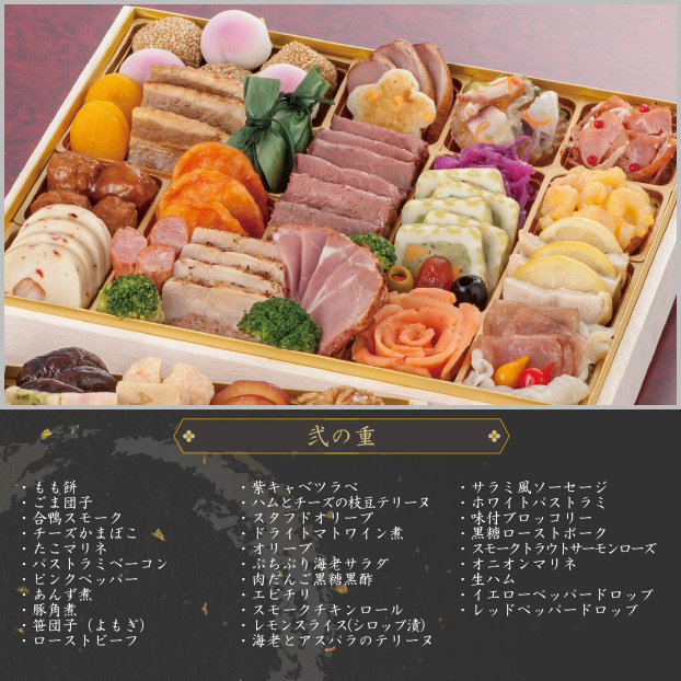 一もも餅、ごま団子、合鴨スモーク、チーズかまぼこ、たこマリネ、パストラミベーコン、ピンクペッパー、あんず煮、豚角煮、笹団子(よもぎ)、ローストビーフ、紫キャベツラぺ、ハムとチーズの枝豆テリーヌ、スタフドオリーブ、ドライトマトワイン煮、オリーブ、ぷちぷり海老サラダ、肉だんご黒糖黒酢、エビチリ、スモークチキンロール、レモンスライス(シロップ漬)、海老とアスパラのテリーヌ、サラミ風ソーセージ、ホワイトパストラミ、味付ブロッコリー、黒糖ローストポーク、スモークトラウトサーモンローズ、オニオンマリネ、生ハム、イエローペッパードロップ、レッドペッパードロップ