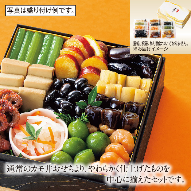 通常のカモ井おせちより、やわらかく仕上げたものを中心に揃えたセットです。