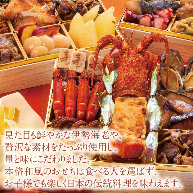 ”見た目も鮮やかな伊勢海老や、贅沢な素材をたっぷり使用し、量と味にこだわりました。本格和風のおせちは食べる人を選ばず、お子様でも楽しく日本の伝統料理を味わえます。”
