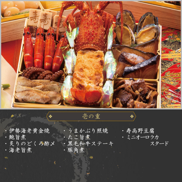 伊勢海老黄金焼鮑旨煮炙りのどくろ酢〆海老旨煮うまかぶり照焼たこ旨煮黒毛和牛ステーキ豚角煮寿高野豆腐ミニオーロラカスタード