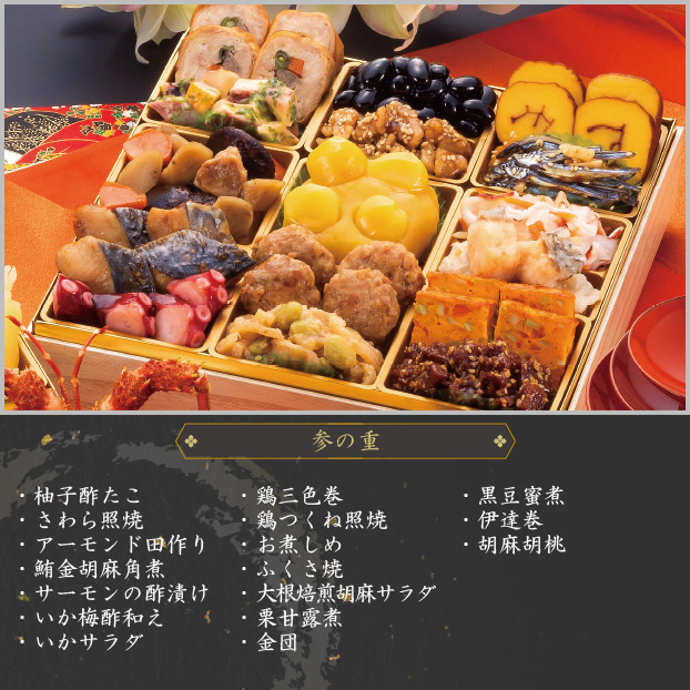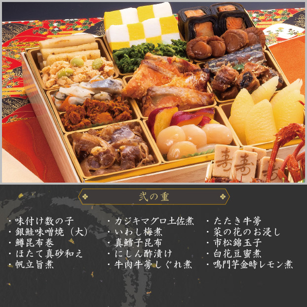 味付け数の子銀鮭味噌焼(大)鱒昆布巻ほたて真砂和え帆立旨煮カジキマグロ土佐煮いわし梅煮真鱈子昆布にしん酢漬け牛肉牛蒡しぐれ煮たたき牛蒡菜の花のお浸し市松錦玉子白花豆蜜煮鳴門芋金時レモン煮