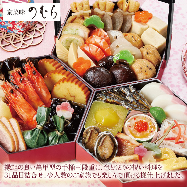 縁起の良い亀甲型の手桶三段重に、色とりどりの祝い料理を31品目詰合せ、少人数のご家族でも楽しんで頂ける様仕上げました。