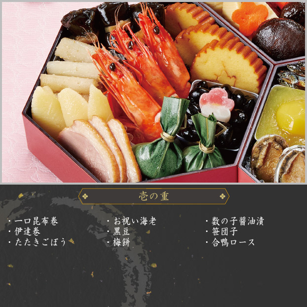 一口昆布巻、伊達巻、たたきごぼう、お祝い海老、黒豆、梅餅、数の子醤油漬、笹団子、合鴨ロース