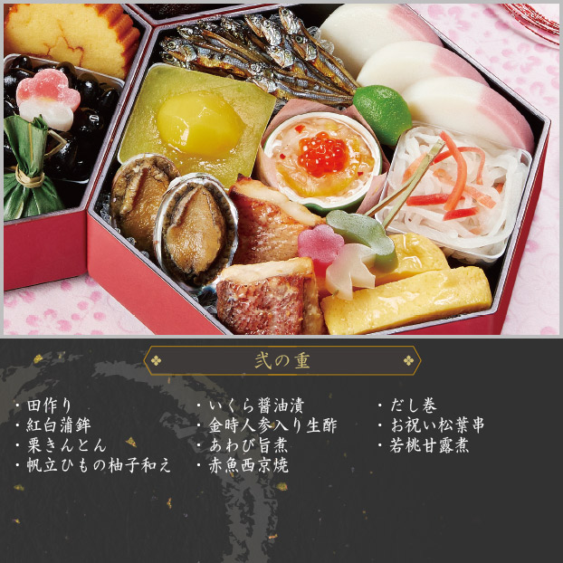 田作り、紅白蒲鉾、栗きんとん、帆立ひもの柚子和え、いくら醤油漬、金時人参入り生酢、あわび旨煮、赤魚西京焼、だし巻、お祝い松葉串、若桃甘露煮