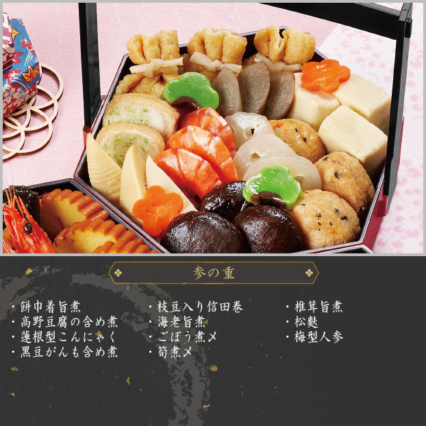 餅巾着旨煮、高野豆腐の含め煮、蓮根型こんにゃく、黒豆がんも含め煮、枝豆入り信田巻、海老旨煮、ごぼう煮〆、筍煮〆、椎茸旨煮、松麩、梅型人参
