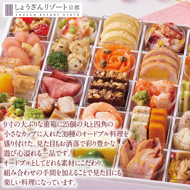 九寸の大ぶりな重箱に25個の丸と四角の小さなカップに入れた39種のオードブル料理を盛り付けた、見た目もお洒落で彩り豊かな遊び心溢れる一品です。オードブルとしてどれも素材にこだわり、組み合わせの手間を加えることで見た目にも楽しい料理になっています。