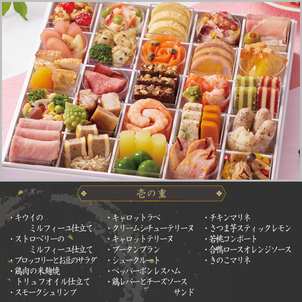 チェリーグラッセメープルくるみカナダホッキ貝わさびサラダチーズとベーコンのパイ包みたこのバジルソーススタッフドオリーブ生ハムマリネりんご赤ワイン煮レモンシロップ漬帆立バジル焼ブロッコリーバジルオイル漬紫キャベツのラペローズサーモントラウトケッパー添えコンソメゼリーパンプキンチキンテリーヌリンゴタルト豚肉の柚子胡椒焼杏子コンポートローストビーフトリュフソース掛けミックスナッツブラウニーロマネスココンソメ味カニ風味かまぼこキウイのミルフィーユ仕立てストロベリーのミルフィーユ仕立てブロッコリーとお豆のサラダ鶏肉の米麹焼トリュフオイル仕立てスモークシュリンプキャロットラペクリームシチューテリーヌキャロットテリーヌブータンブランシュークルートペッパーボンレスハム鶏レバーとチーズソースサンドチキンマリネさつま芋スティックレモン若桃コンポート合鴨ロースオレンジソース、きのこマリネ
