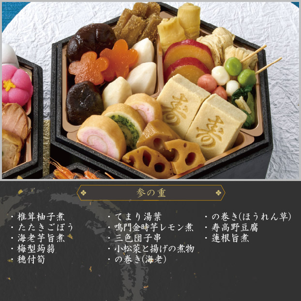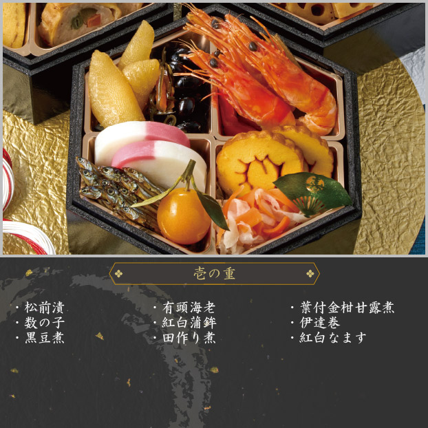 松前漬、数の子、黒豆煮、有頭海老、紅白蒲鉾、田作り煮、葉付金柑甘露煮、伊達巻、紅白なます、寿昆布扇子