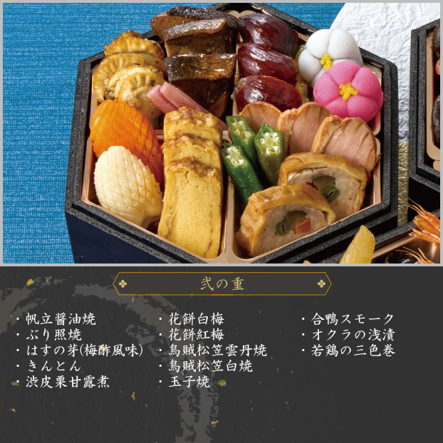 帆立醤油焼、ぶり照焼、はすの芽(梅酢風味)、きんとん、渋皮栗甘露煮、花餅白梅、花餅紅梅、烏賊松笠雲丹焼、烏賊松笠白焼、玉子焼、合鴨スモーク、オクラの浅漬、若鶏の三色巻