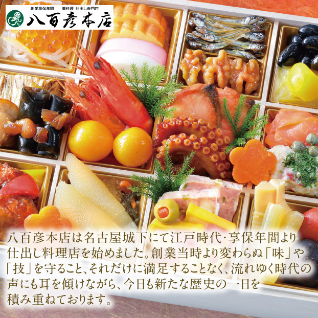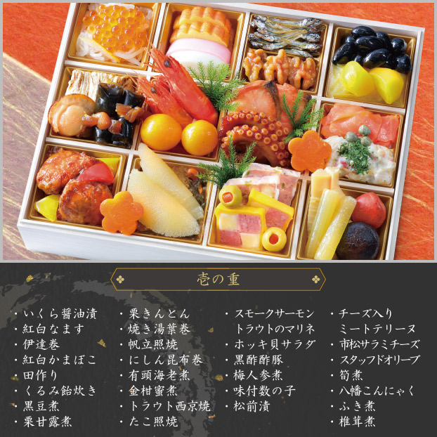 いくら醤油漬、紅白なます、伊達巻、紅白かまぼこ、田作り、くるみ飴炊き、黒豆煮、栗甘露煮、栗きんとん、焼き湯葉巻、帆立照焼、にしん昆布巻、有頭海老煮、金柑蜜煮、トラウト西京焼、たこ照焼、スモークサーモントラウトのマリネ、ホッキ貝サラダ、黒酢酢豚、梅人参煮、味付数の子、松前漬、チーズ入りミートテリーヌ、市松サラミチーズ、スタッフドオリーブ、筍煮、八幡こんにゃく、ふき煮、椎茸煮