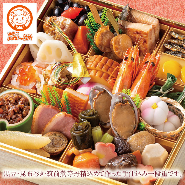 黒豆・昆布巻き・筑前煮等丹精込めて作った手仕込み一段重です。