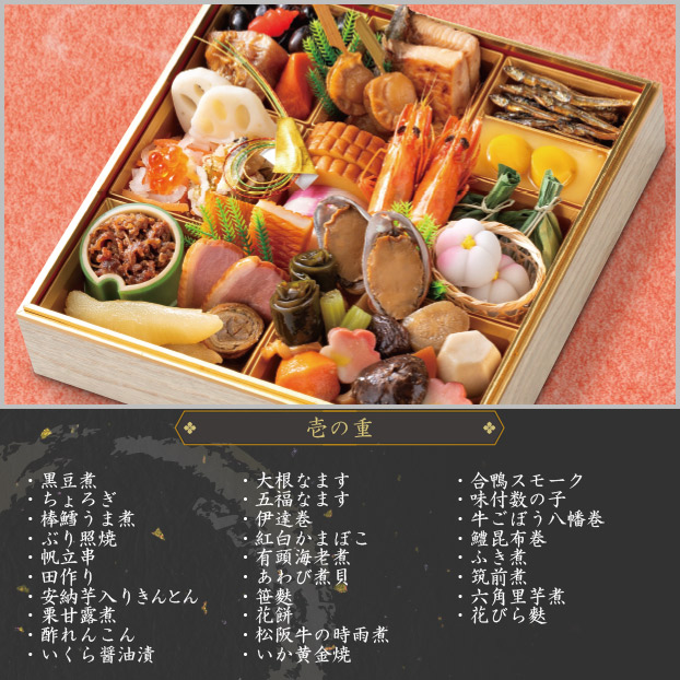 黒豆煮、ちょろぎ、棒鱈うま煮、ぶり照焼、帆立串、田作り、安納芋入りきんとん、栗甘露煮、酢れんこん、いくら醤油漬、大根なます、五福なます、伊達巻、紅白かまぼこ、有頭海老煮、あわび煮貝、笹麩、花餅、松阪牛の時雨煮、いか黄金焼、合鴨スモーク、味付数の子、牛ごぼう八幡巻、鱧昆布巻、ふき煮、筑前煮、六角里芋煮、花びら麩