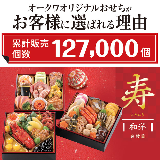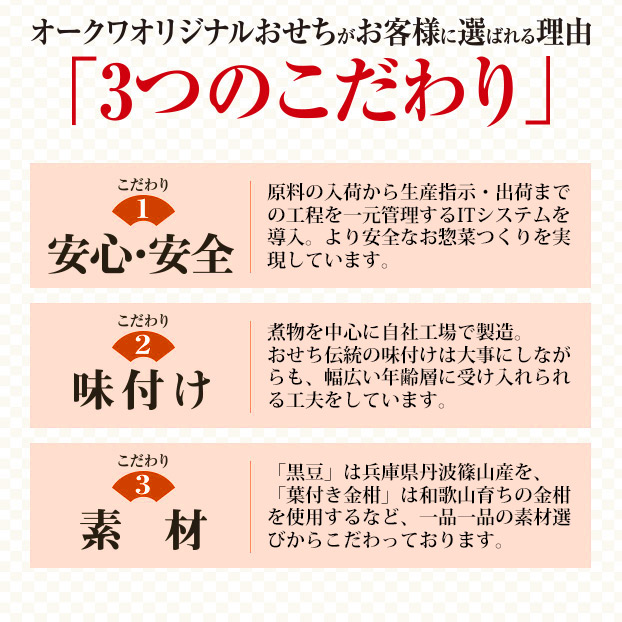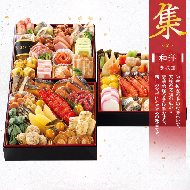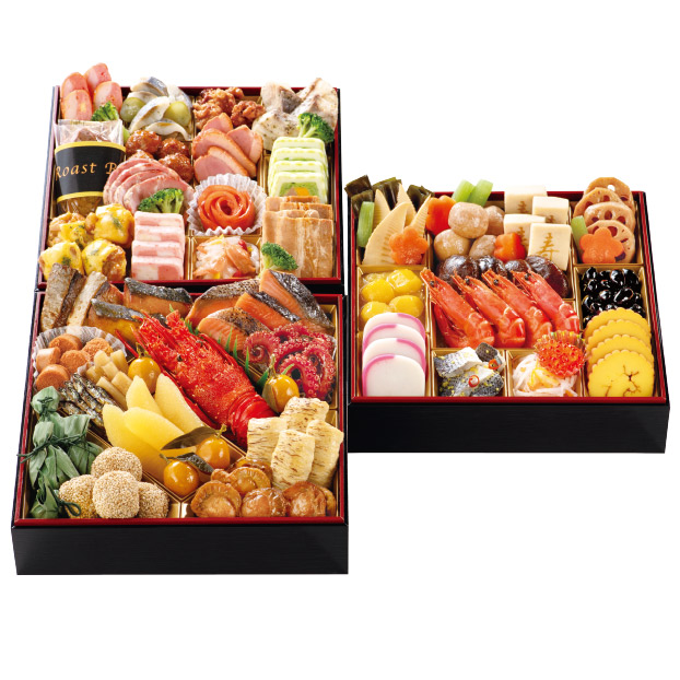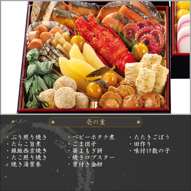 ぶり照り焼き、たらこ旨煮、銀鮭西京焼き、たこ照り焼き、焼き湯葉巻、ベビーホタテ煮、ごま団子、笹よもぎ餅、焼きロブスター、葉付き金柑、たたきごぼう、田作り、味付け数の子